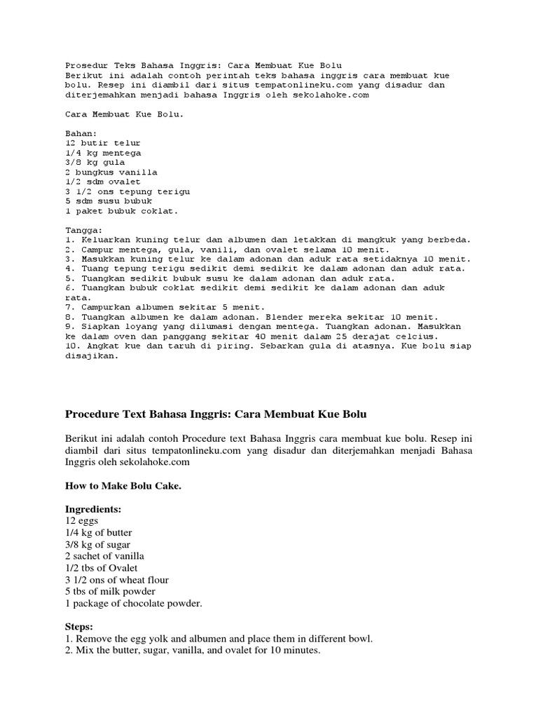 Kue bolu menjadi makanan yang banyak digemari anak-anak. 3 Terakhir tepung terigu dan mentega dimasukkan kemudian aduk hingga rata. Contoh Procedure Teks Bolu Pandan dipostkan pada.